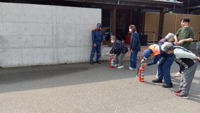 3月24日ミヤノ屋(おでんの会)のあとで、ミヤノ屋に参加されていた地域住民と一緒に防火訓練をおこないました。水消火器で消化器の使い方を確認しました。